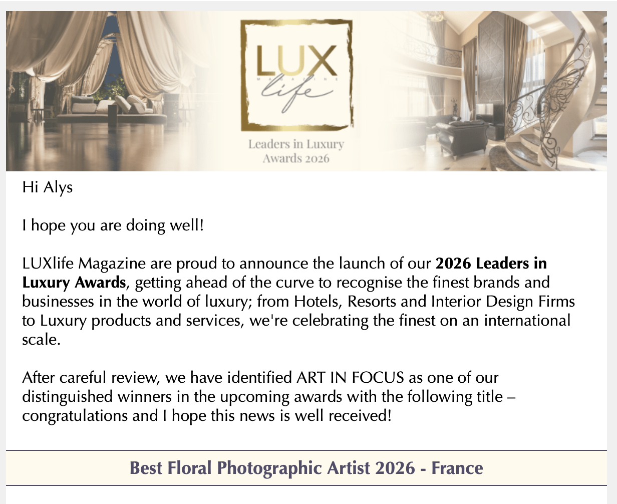 LUX LIFE - Leaders in Luxury Awards. Best Floral Photographic Artist 2026